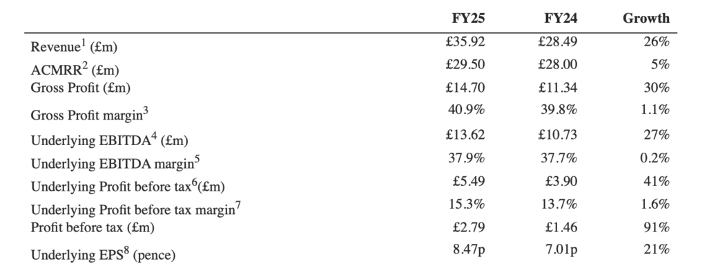 Revenue increased by 26% per year to £ 35.9 million, supported by expanding with existing customers and new contract wins. Repeated revenue represented 71% of total revenue (2024: 84%), reflecting the product mix, especially the highest percentage of proximity and exchange of Cloud® (as part of the previous model) which have an income recognition element in advance.